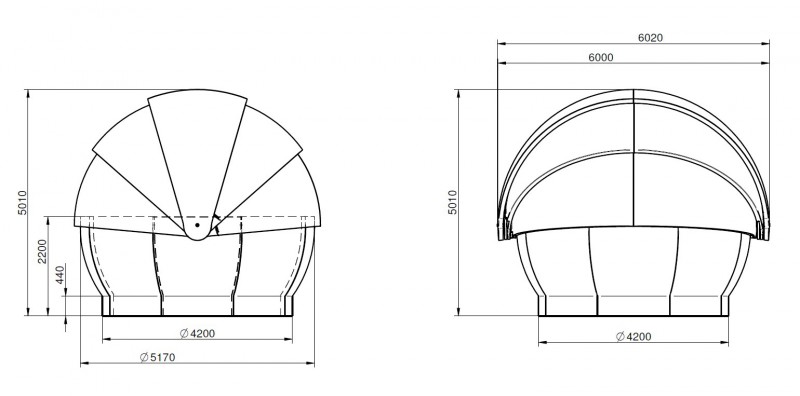 Die Clamshell-Kuppel ist die bevorzugte Sternwartenkuppel für LASER COMMUNICATION und BIG-APERTURE Teleskope. Es ist nicht notwendig, das Teleskop mit der Kuppel zu synchronisieren. Beide "Rolläden" können unabhängig voneinander bewegt und positioniert werden, um eine Windabschattung der optischen Gruppe zu ermöglichen.