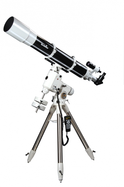 Die parallaktische EQ-6 Montierung ist eine massive aber noch gut zu transportierende Montierung mit ca. 18 kg Gewicht. Sie trägt Geräte bis ca. 20 kg, verträgt also den 150er Refraktor noch gut und ist damit noch nicht an der Grenze angelangt. Man kann Sie für Instrumente bis 250 mm Öffnung verwenden. Die EQ-6 hat zwei fest eingebaute Motoren inklusive einer Steuerung die sich auch für Astrofotografie eignet. Die groß dimensionierten Teilkreise lassen eine genaue Einstellung über Koordinaten zu. Mit dem eingebauten, neuartigen und überarbeiteten Polsucher ist die Montierung schnell und exakt auf die Himmelspole ausgerichtet. Das bis zu 120 cm höhenverstellbare Metallstativ lässt für die meisten Ansprüche sicher keine Wünsche offen.