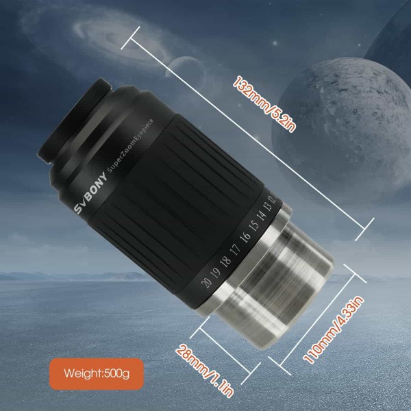 Das SV230 ist ein asphärisches Superzoom-Okular mit einer Brennweite von 8 mm bis 20 mm und einer Klick-Stopp-Einrastung. Das Okular hat ein scheinbares Gesichtsfeld von 55°-75° und bietet höchsten Beobachtungskomfort. Es unterstützt auch den Anschluss eines Astigmatismuskorrektors. Der große Augenabstand von 17-19 mm ermöglicht eine bequeme Beobachtungsposition auch für Brillenträger. Es kann sowohl bei Tag als auch bei Nacht verwendet werden und bietet eine hervorragende Auflösung und Kontrast sowie ein scharfes Bild mit einem großen scheinbaren Gesichtsfeld. Die Planetenbeobachtung mit dem SV230-Okular ist nicht nur äußerst komfortabel, sondern auch von hoher Qualität, da es klare und unverzerrte Bilder ohne Randverzerrung liefert. Für grossflächige DeepSky-Beobachtungen eignet sich das Okular ebenso.