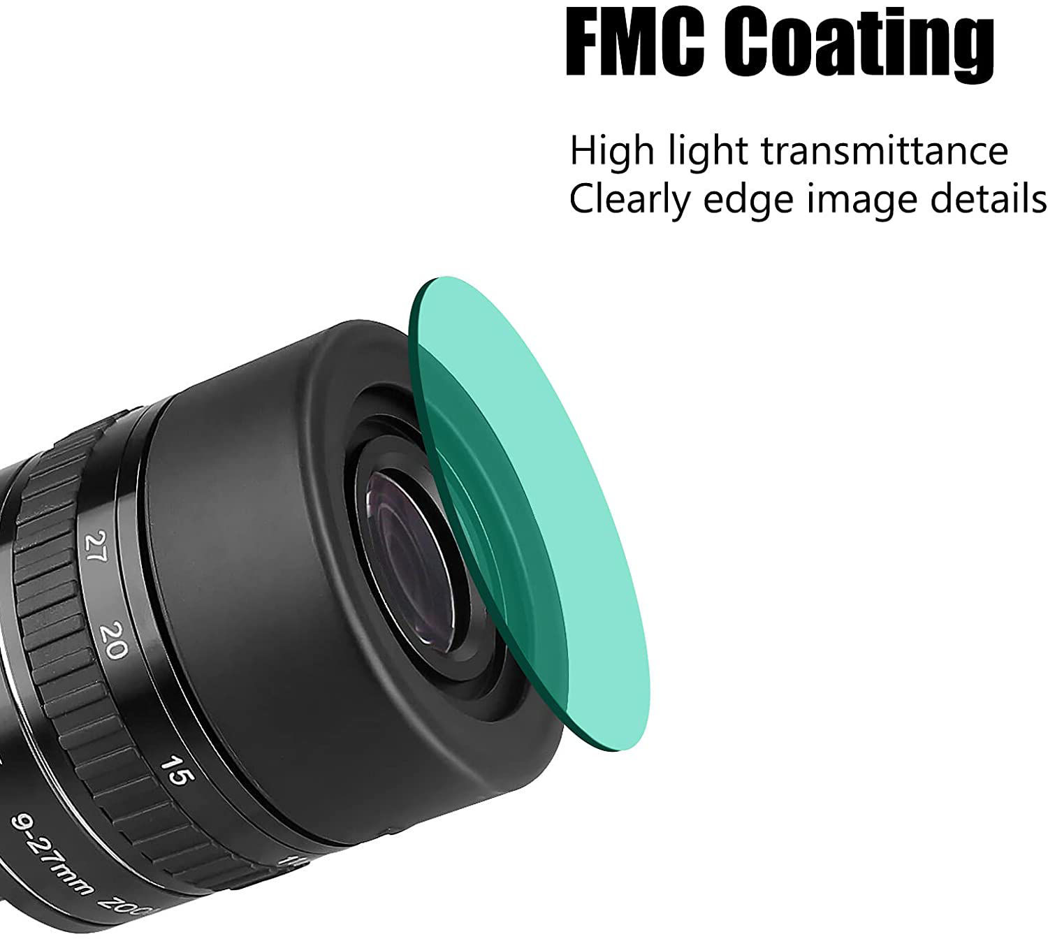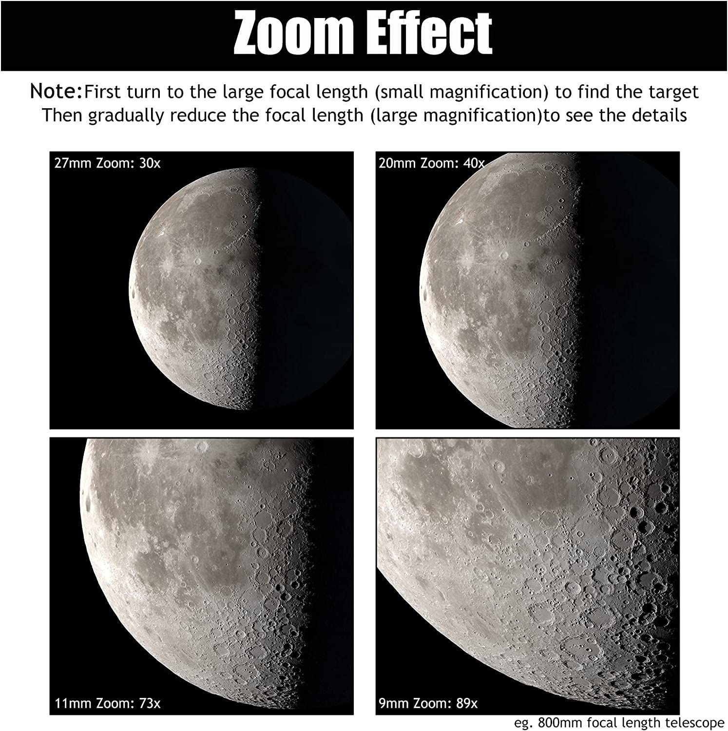 Das Zoom-Okular bietet ein variables Gesichtsfeld von 40° bis 60° und eine Brennweite von 9 bis 27 mm, wodurch ein flexibler Wechsel der Vergrößerung ohne Okulartausch möglich ist. So lassen sich die Anforderungen einer vielseitigen und abwechslungsreichen astronomischen Beobachtung optimal erfüllen. Die 1,25-Zoll-Standard-Okularschnittstelle gewährleistet eine hohe Kompatibilität mit den meisten astronomischen Teleskopen.