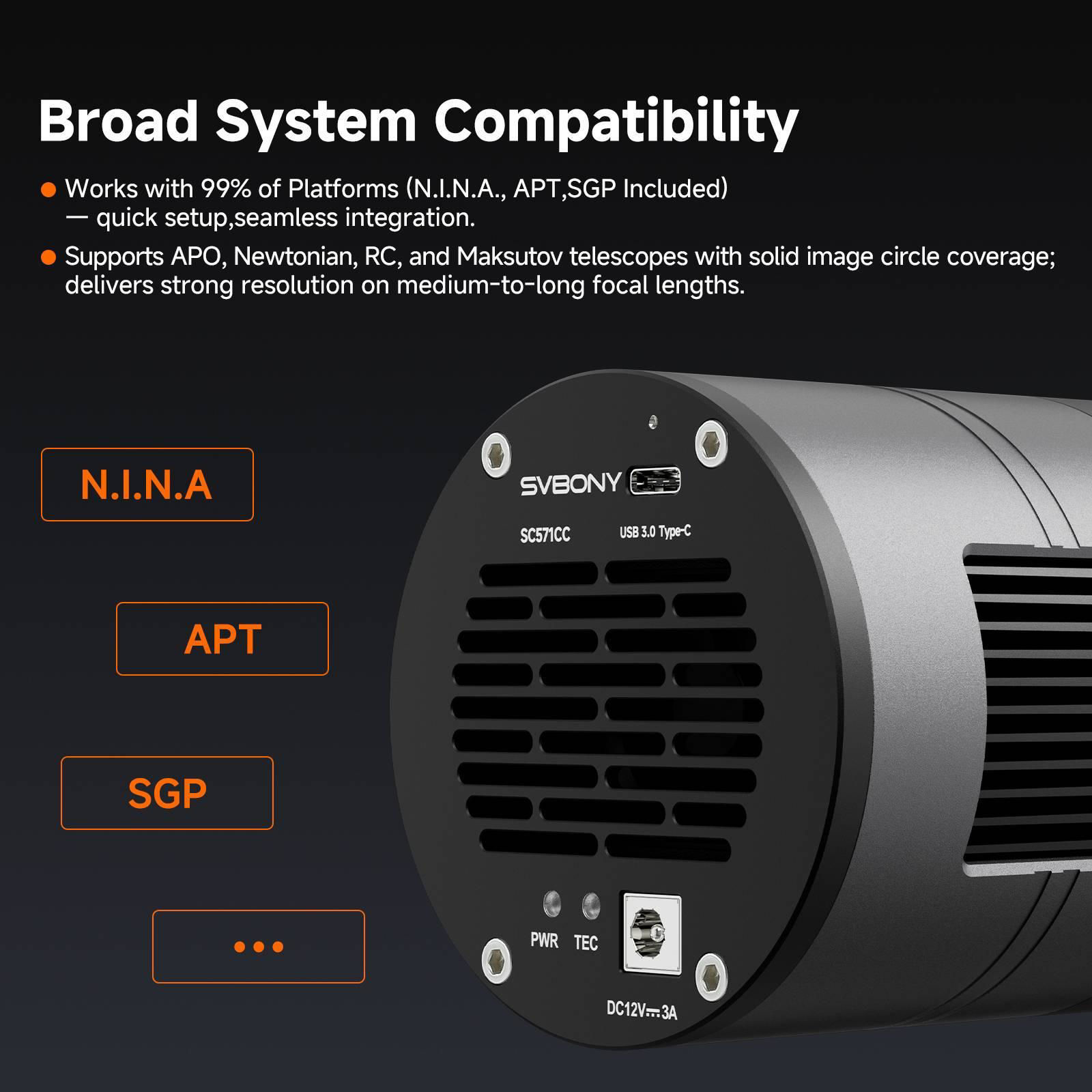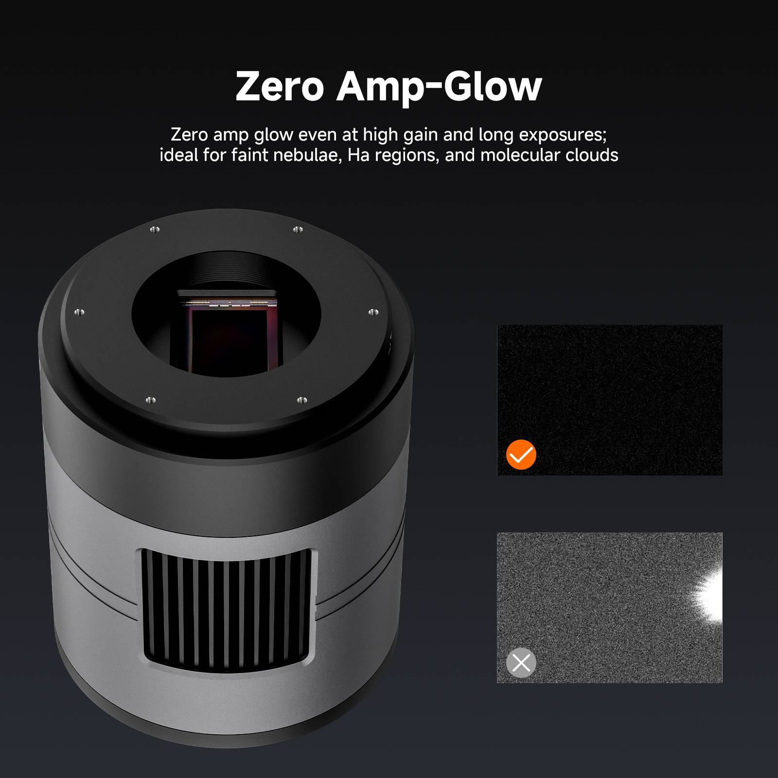 Die SC571CC verwendet den Sony IMX571 CMOS-Sensor und bietet 26 Megapixel (6244 × 4168) hohe Auflösung mit einer Pixelgröße von 3,76 µm. Der großformatige APS-C-Sensor ermöglicht ein deutlich größeres Himmelsfeld, ideal zum einfachen Einfangen großflächiger Nebel, Sternhaufen und Galaxienstrukturen. Dank 16-Bit-ADC können mehr Details in den dunklen Bildbereichen erhalten werden. Das Zero-Amp-Glow-Design stellt sicher, dass auch bei langen Belichtungszeiten ein sauberer Hintergrund erhalten bleibt, sodass schwache Signalbereiche leichter erfasst werden können.