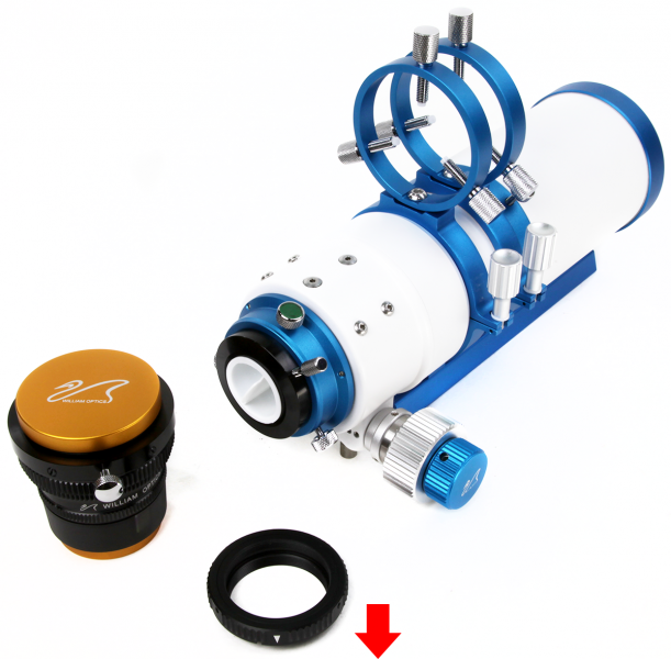 Montage: Der Flattener wird fest auf das Gewinde des Okularauszugs geschraubt. Schrauben Sie dazu so wie im Bild rechts gezeigt einfach das farbig eloxierte Endstück ab. Dieses Endstück dient der Aufnahme einer Steckhülse, wird aber bei der Verwendung eines Flatteners nicht mehr benötigt. Heben Sie es gut auf, für den Fall, dass Sie die Optik visuell mit einem Zenitspiegel nutzen möchten. Der Flattener kann dann einfach in das Gewinde des Okularauszugs eingeschraubt werden.