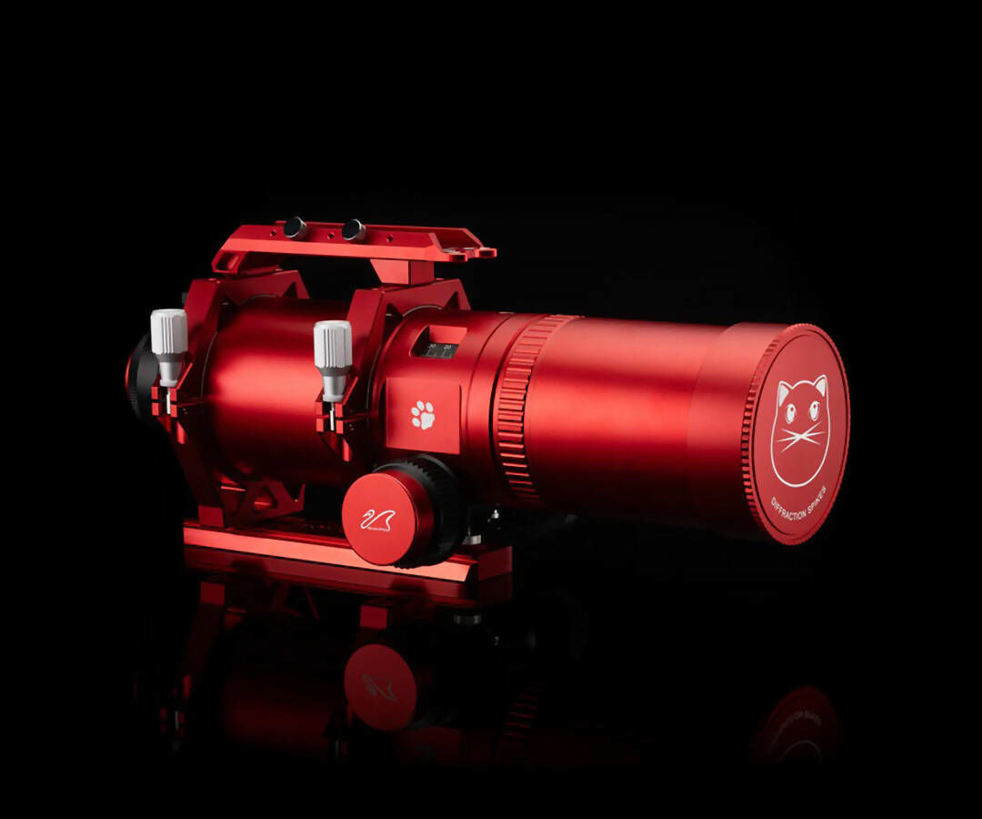 Dieser apochromatische Refraktor wendet sich an alle Astrofotografen und Naturfotografen, die ein transportables und knackscharfes Teleobjektiv suchen. Durch das 4-elementige Petzvaldesign wird ein farbreines und voll korrigiertes Bildfeld über 48 mm Durchmesser erreicht. So ist sogar der Einsatz von Vollformatkameras möglich. Die Scharfstellung arbeitet wie bei vielen Teleobjektiven intern, aber wie bei Teleskopen über Knöpfe mit einem zusätzlichen Feinfokussierknopf.