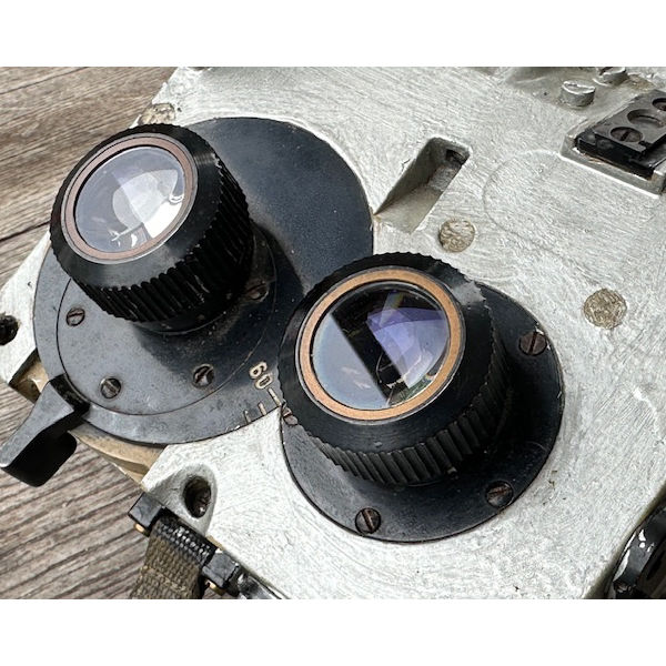 Zeiss 12 x 60 BLC Kriegsmarine ( Richtungsweiser-Fernrohr) Fernglas blcxRm.-F12x60 für Em4mR40 mit 60 Grad einblick. "blc" ist die Codierung für Zeiss Jena ab November 1940. RM.-F. ist die Ab- kürzung für Richtmann-Fernrohr. EM 4m = Entfernungsmesser 4m Basis. Zum Einstellen der Augenweite ist das linke Okular exzent risch in einer dreh- baren Scheibe montiert. Mit dem Hebel vorne wird die Augeweite eingestellt. Gewicht dieses Glases 3628 Gramm, Breite 16,5 cm , Länge 27 cm. Die wuchtigen Okulare haben 40 mm im Durchmesser. Die Okularlinsen messen 26 mm. Der seitliche Augenabstand lässt sich verstellen von ca.57 mm bis 72 mm. Die Okulare sind Brillenträger geeignet . Sichtfeld: 5 deg = 86,6 m/1.000 m; APFOV 60 Grad Okularseitig, Austrittspupille: 5 mm. Jeder Tubus besteht aus einem Amici-Dachprisma und einem 60°-Abweichungsprisma, die miteinander verklebt sind (siehe Ansicht 5: www.flickr.com/photos/binocwpg/9548656535/in/photostream/ ). Dieses Prismensystem hat zwei Luftglasflächen anstelle der vier, die bei den meisten Porro-I- und Dachkantprismen-Ferngläsern vorhanden sind, was die Lichtdurchlässigkeit verbessert und ein helleres Bild ergibt. Zustand deutlich gebraucht, siehe Bilder. Justierung bei Durchschauen ist gut und nicht gelblich. Es wurde ein Stativadapter mit 1/4-20 Innengewinde angebracht. Die Okulare fokusieren gut und der Augenabstand lässt sich gut einstellen. Das Farbglasrad dreht sich nicht, somit sind keine Filter einschwenkbar.Die metallene Okularkappe funktioniert sehr gut.Das rechte Objektiv sieht ganz gut aus. Das linke Objektiv hat ein paar Flecken, die beim durchsehen nicht auffallen. Beim vorne hineinschauen fällt auf das beide zu sehende Prismen fleckig sind. Auch da sfällt beim Durchsehen nicht auf. Da ein Service mit Reinigung über 1000 Euro kosten würde, lebe ich mit dem aktuellen Zustand sehr gut.