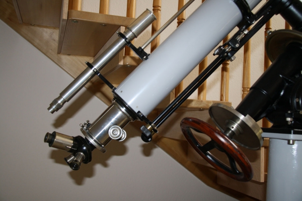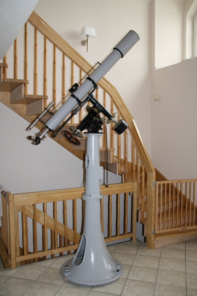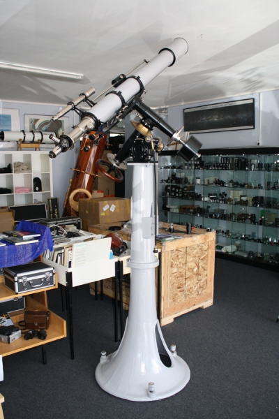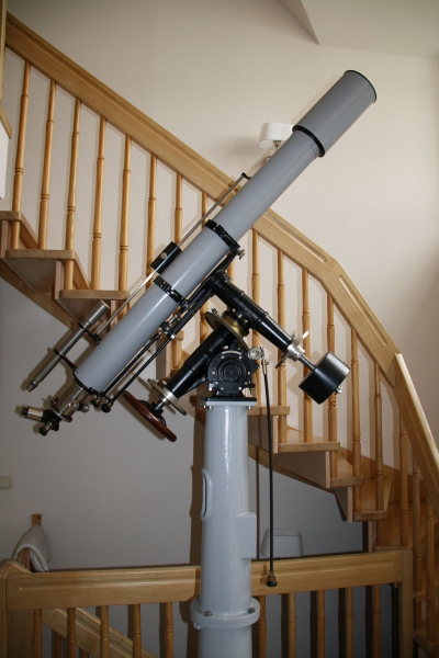 Zeiss Jena Refraktor E 110 mm f/1560 mm ( Serien Nr. 3454 E) mit Zeiss Montierung, Säule und Zubehör, siehe Bilder. Das Teleskop wurde durch Fachleute komplett Renoviert und im Juli 2009 fertiggestellt.