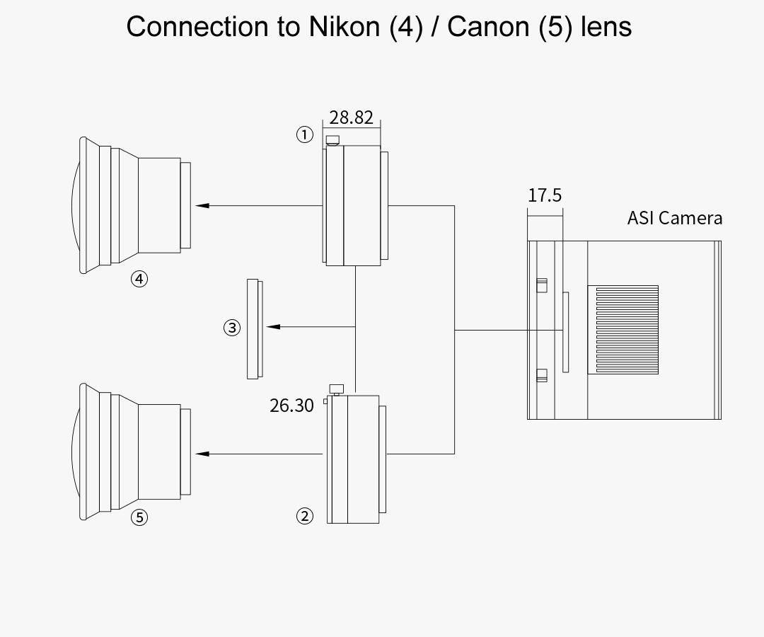 Der Hersteller gibt, siehe siebtes Bild, Hinweise zum direkten Anschluss von Nikon-F- oder Canon-EOS-Objektiven, hat aber die passenden Adapter nicht mehr im Sortiment. Sie können aber mit einem zum Bajonett passenden und bei TS lieferbaren Adapter und einem Verlängerungsring in den Fokus kommen.Sie benötigen außer dem Objektiv noch ZWO-EFW2-NIKON oder ZWO-EFW2-EOS TSVM5415
