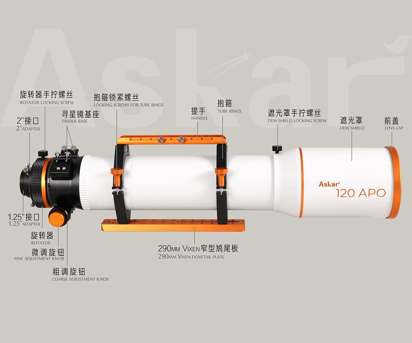 The entire Askar 120APO tube is crafted using high-quality CNC machining, with anodized and surface spray paint treatment. The orange accents on the ivory-white tube add a bright and eye-catching touch, presenting a stylish and elegant overall appearance.