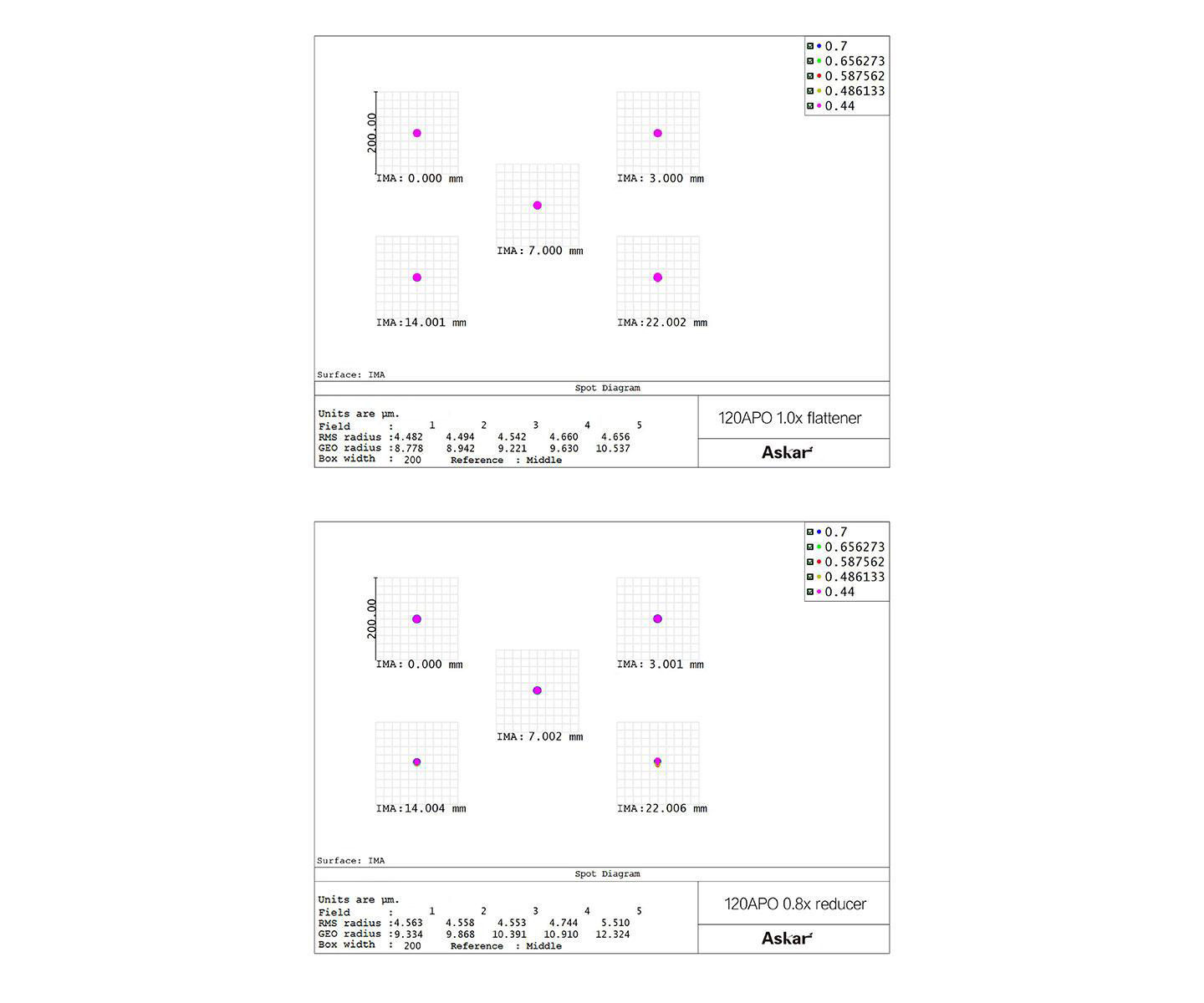 The 1x flattener does not change the telescope´s focal ratio itself. After connecting with the Askar 120APO, it still retains a focal ratio of f/7. The flattener corrects field curvature and coma, resulting in flatter field edges and finer star points.