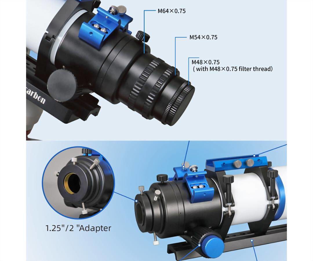 For visual use, but also for the use with some compatible cameras, you can easily replace this photographic adapter with the included 1.25"/2" visual back. This allows using almost any eyepiece within your collection, while also offering the use with 1.25" or 2" diagonals (not included) for heightened comfort.
