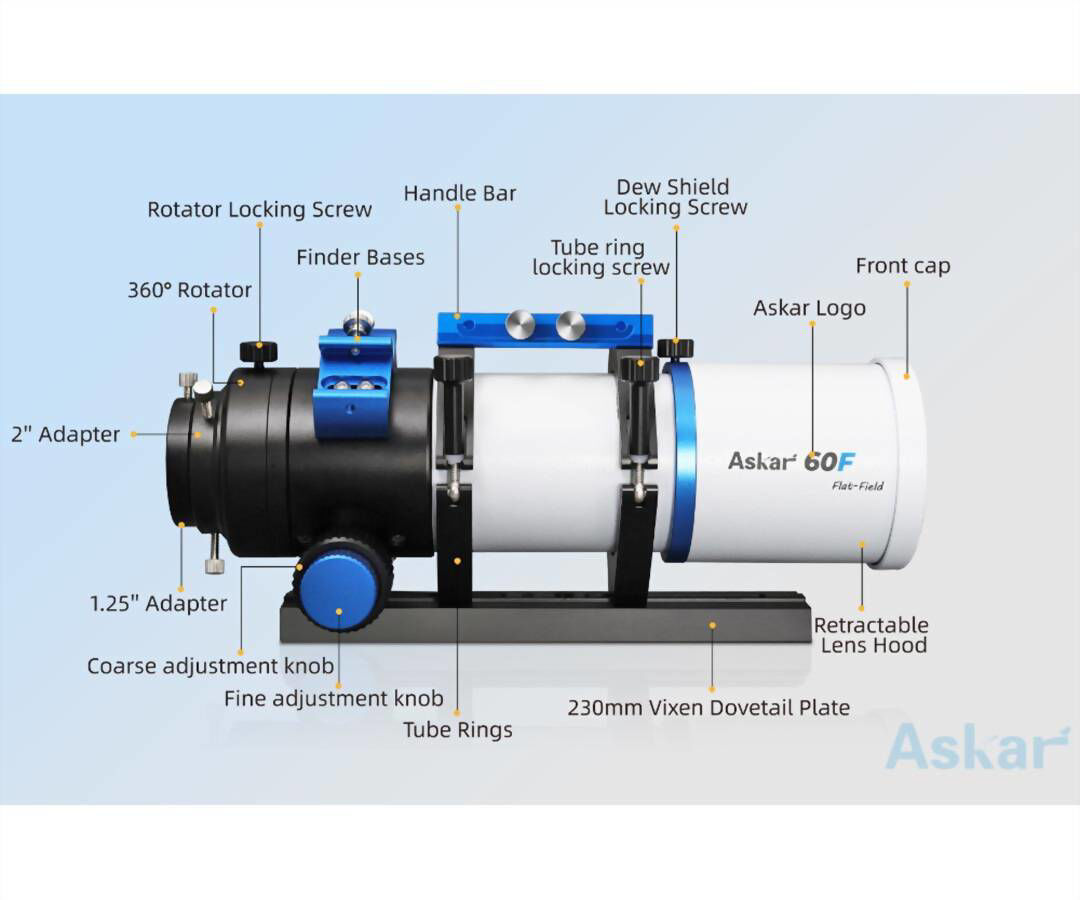 Several accessories are included within this package to help you get started! As mentioned above, a photographic adapter set and 1.25"/2" visual back come standard with this Askar 60F refractor for effortless gear attachment. A set of tube rings hold your telescope secure, while the 230 mm Vixen dovetail plate enables use with a host of equatorial mounts. Atop these tube rings is a dual-use handle bar for easy transport and accessory attachment. Two additional finder bases are also included within the box for extra accessory support. Shield your views from stray light with the retractable dew shield and easily find the perfect framing thanks to the built-in 360° rotator.