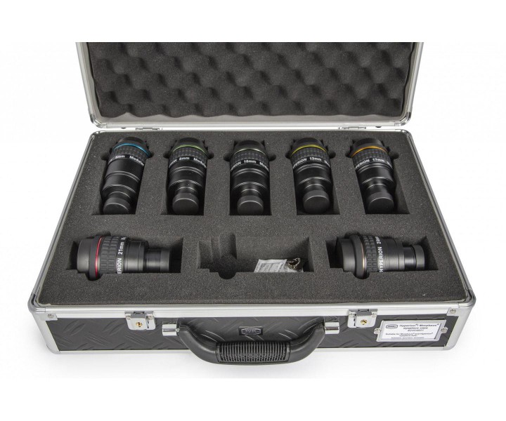 A packet offer for a special price: 7pc Baader 1.25" Hyperion eyepieces in a useful case with cut foam inlays. Now you are ready for nearly any astronomical task! The standard set contains the following focal lengths: 5, 8, 10, 13, 17, 21, 24 mm including the case. Alternatively, you may also choose other focal lenghth (also the new 10 mm) and/or more eyepieces of one focal length. The only limitation is the number of eyepieces (seven).