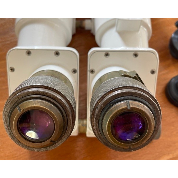 Flak Binocular D.F. 10x80 Flakglas , Multi-coated lenses and eyepieces, for the age is the binoculars in very good condition. The glass was repainted in this year 2021. The original eyepieces can be unscrewed. We have turned 1.25" screw-in eyepiece adapters for this, so that standard 1.25" astro eyepieces can now be used. The interpupillary distance can be finely adjusted. The alignment is very good. It is rare to find such a 10 x 80 wehrmachtsglas in a such good condition.