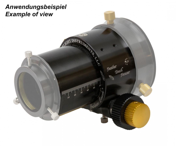Starlight Instruments Feather Touch FTF2525HD - 63 mm clear aperture (2.5") This rack and pinion focuser is for all amateur astronomers who needs a bigger focuser than 2" which should be compact. The focuser especially offers a better illumination, needed for working with larger sensors. With 63.5 mm, the travel range is generous. Currently, this focuser is praised as a better alternative to 2" focusers. The advantages of the 2.5" Feather Touch focuser: ♦ 100% correct position of of the image plane - no tilting or bending ♦ Clear aperture of 63 mm, enough to illuminate full-frame sensors ♦ Best mechanical workmanship ♦ Internal baffles ♦ Gentle clamping by compression ring Technical information: ♦ Robust housing - no bending ♦ 1:10 gear reduction for exact focusing ♦ free adaption to different telescope types (connection adapters can be found at the accessories recommendations) ♦ Brake for adjusting of the drag and clamping of the draw tube ♦ Rack and pinion, no friction - for even better transmission of power ♦ Brass gear rack and hardened stainless steel gear wheels ensures precise adjustment even under maximum load ♦ Helical gears for smooth motion ♦ Screw-on extension tubes (see recommended acessories) Note: connection adapters to the telescope are not included in the scope of delivery. Connection adapters to the telescope are listed under "Accessories for mounts". Eyepiece-side and camera-side adapters are listed under "Adaptors".