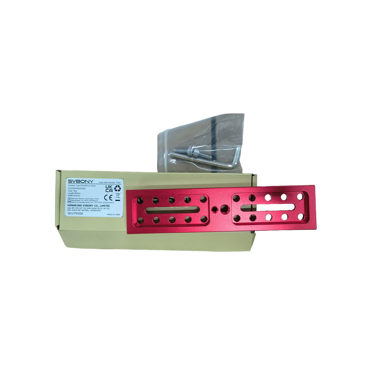 | Technical Data | | Specifications | 185mm | 254mm | | Net Weight | 130g | 172g | | Appearance Color | Red | Red | | Dimensions | Height:15.5mm | Height:15.5mm | | Length:185mm | Length:254mm | Upper width:38mm Lower width:43.5mm | Upper width:38mm Lower width:43.5mm | | Surface Treatment | Anodized | Anodized | | Mounting Interface Standards | Vixen & Arca Swiss | Vixen & Arca Swiss | | Thread Specifications | UNC 1/4-20 & UNC 3/8-16 | UNC 1/4-20 & UNC 3/8-16 | | Through Hole Inner Diameter | 6.5mm | 6.5mm | | Top/Bottom Groove Depth | 6mm | 6mm | | Slot Length | 55mm | 87mm | | Slot Width | 6.5mm | 6.5mm |