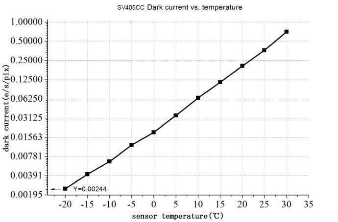 The SV405CC camera’s TEC cooling system can precisely control the sensor’s temperature. Unlike conventional CCDs, the SV405CC camera features extremely low readout noise and efficient cooling. It is no longer necessary to use ultra-long exposure times to capture targets, which significantly reduces the demands placed on the camera system and the guide star system. However, when short exposures are used (e.g. less than 100 ms), the cooling has little effect on the image. The cooling system can be set to a minimum of 35–40 °C below ambient temperature (tested based on an ambient temperature of 30 °C). Please note that the maximum temperature difference may vary after prolonged use. Meanwhile, if the ambient temperature drops, the cooling temperature difference will also decrease accordingly. The figure below shows the dark current curve of the SV405CC sensor between -20 °C and 35 °C.