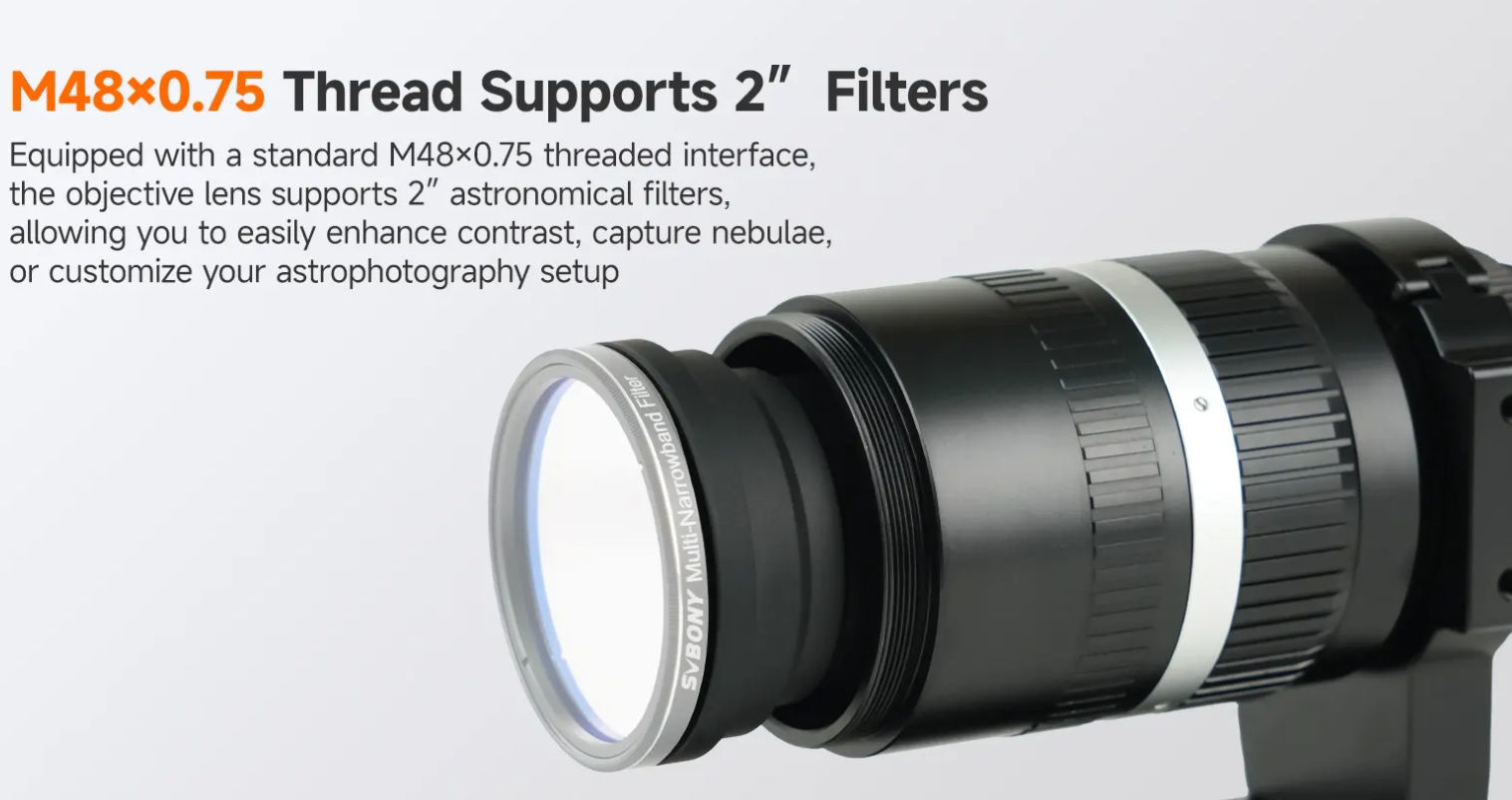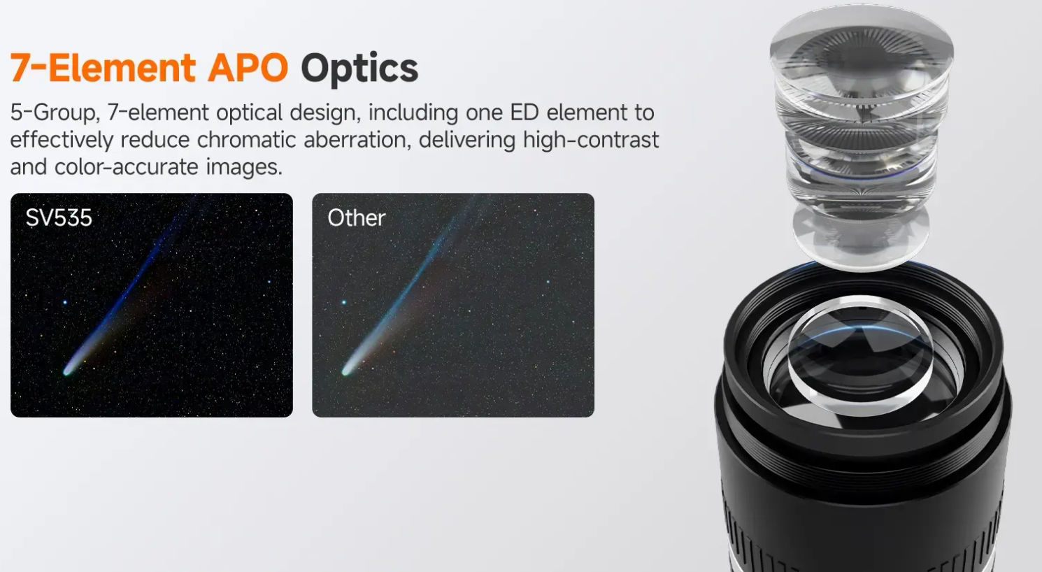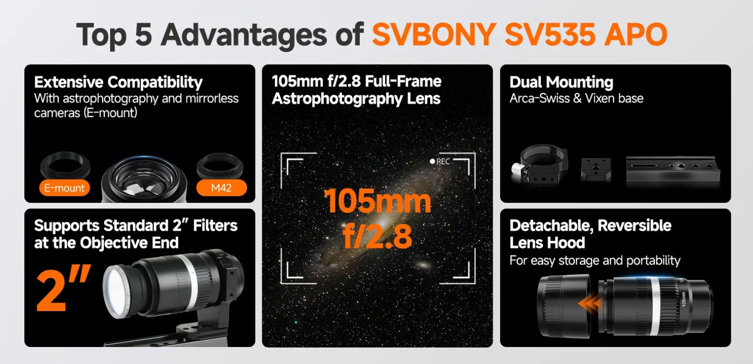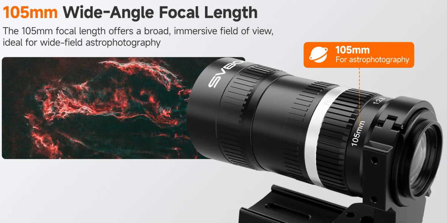 105 mm focal length combined with an apochromatic optical system for wide fields of view and high resolution.