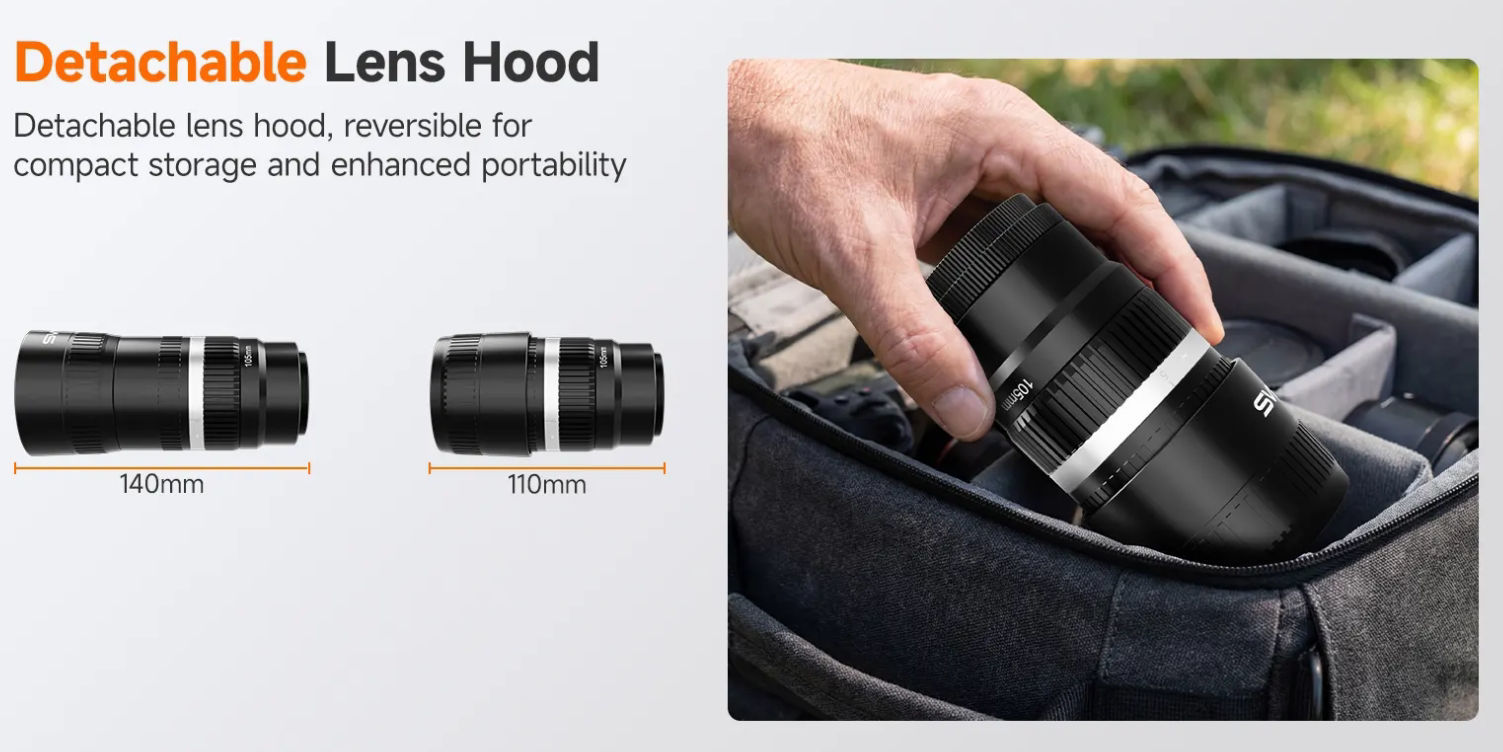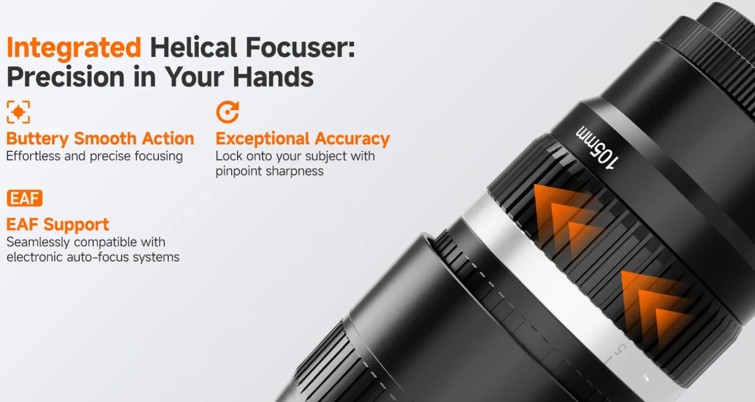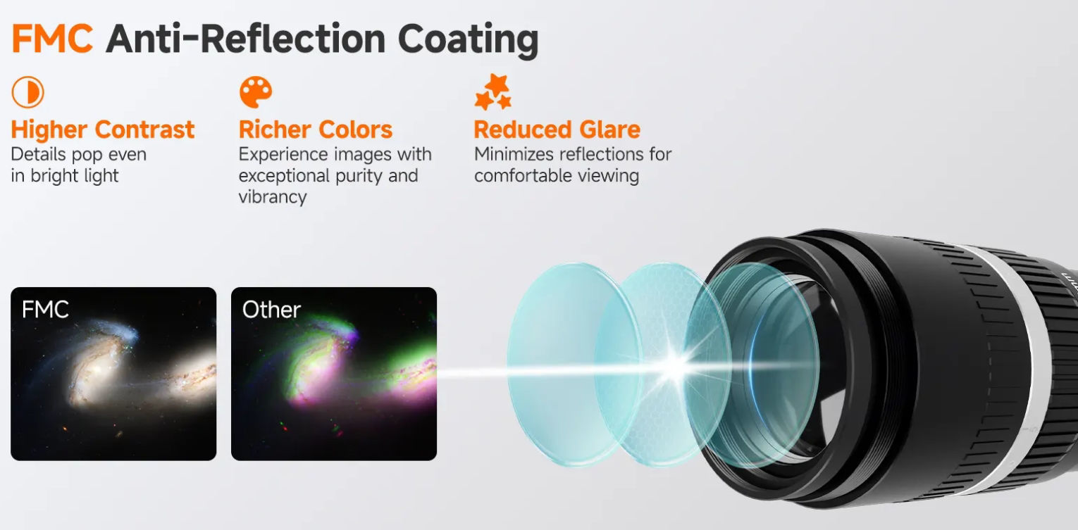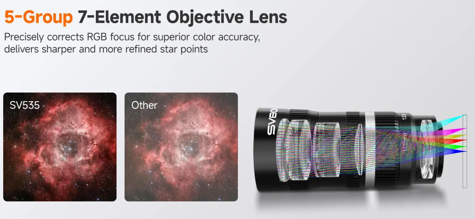 105 mm focal length combined with an apochromatic optical system for wide fields of view and high resolution.