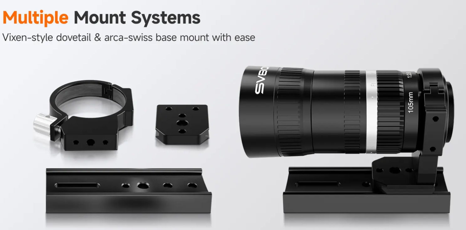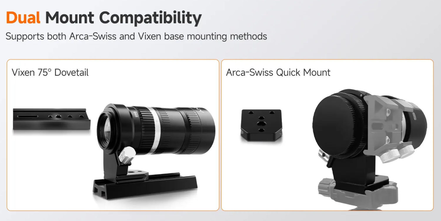 Designed for Vixen and Arca-Swiss standards – for easy integration with different tripods and equatorial mounts.