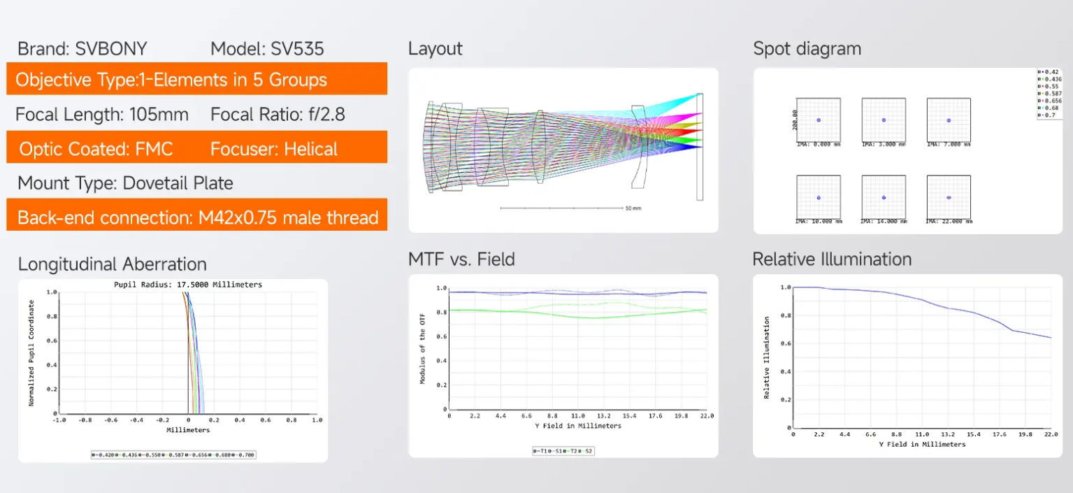 | Model | SV535 | | Lens type | 7 elements in 5 groups | | focal length | 105 mm | | opening ratio | f/2,8 | | remuneration | FMC (Fully Multi-Coated) | | focuser | Helical | | Assembly | Dovetail plate | | Connection (rear) | M42 × 0.75 external thread | | Weight | approx. 1500 g |