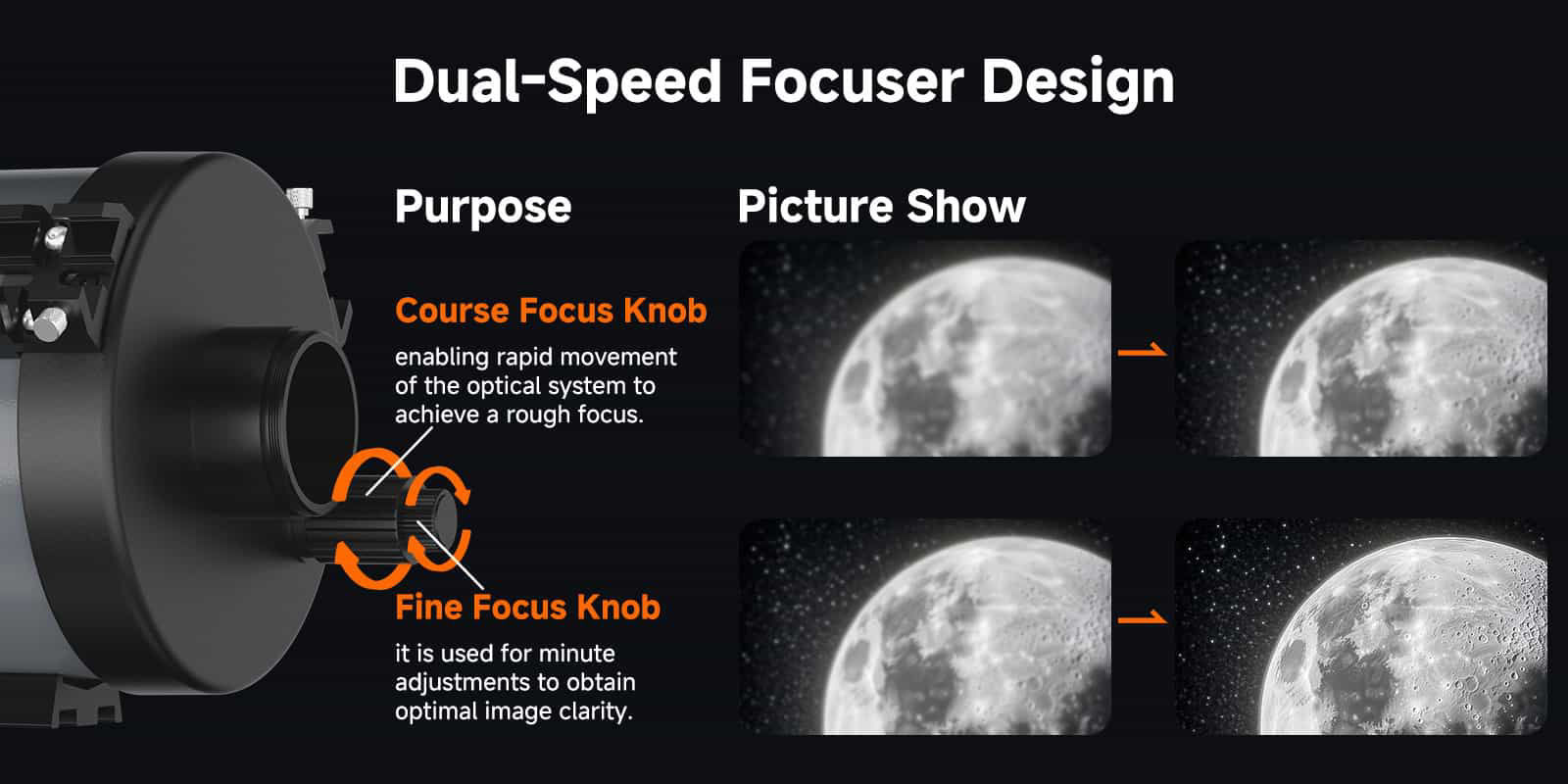 A dual-speed focuser allows for both quick coarse adjustments and precise fine-tuning. This makes observation much easier – particularly at high magnifications or in astrophotography.