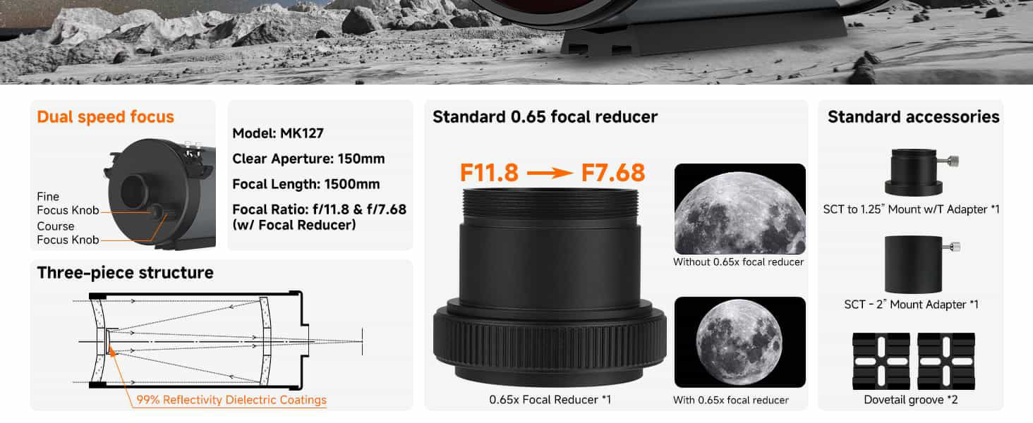 | Technical Data | | Brand | SVBONY | SVBONY | SVBONY | | Model | MK127 | MK105 | MK90 | | Type | Maksutov-Cassegrain optics | Maksutov Cassegrain | Maksutov Cassegrain | | Aperture | 127mm | 105mm | 90mm | | Focal Length | 1500mm | 1365mm | 1250mm | | Focal Ratio | f/11.8 & f/7.15(w/ Focal Reducer) | f/13 | f/13.9 | | Light Gathering Power | 254X | 210x | 180x | | Primary Mirror | Multi-coated Precision Aluminum Coating | Multi-coated Precision Aluminum Coating | Multi-coated Precision Aluminum Coating | | Secondary Mirror | 99% Reflectivity Dielectric Coatings | Multi-coated Precision Aluminum Coating and Multi Coating | Multi-coated Precision Aluminum Coating and Multi Coating | | Focuser | Internal Dual Speed | Internal | Internal | | Mounting | Vixen Style | Vixen Style | Vixen Style | | Mounting Base Number | 2PCS | 1PCS | 1PCS | | Outer Diameter | 145mm | - | - | | Reflectance of High-Reflective Dielectric Coating | 99% | 82% | over 89% | | Net Weight | 2934g / 6.47lb | 2193g | 1380g | | Adapter Thread | SCT Male thread (2" 24TPI) | M42x0.75 for T-ring | M42x0.75 for T-ring | | Accessories | 0.65x Focal Reducer; SCT -2" Mount Adapter; SCT to 1.25" Mount w/ T Adapter | Dovetail Mounting Base, Dovetail Plate 160mm | Dovetail Mounting Base, Dovetail Plate 70mm | | Package Dimension | | / | 360x170x170mm |