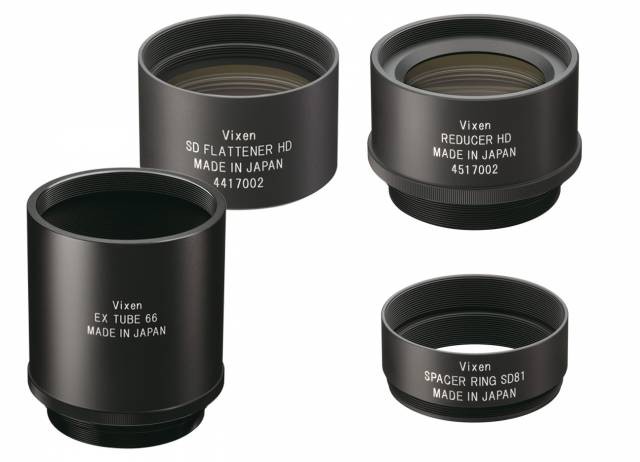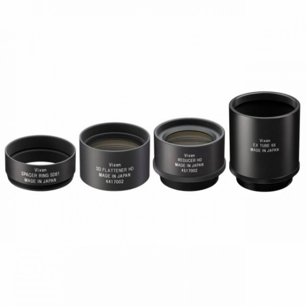 The kit consists of a high-performance flattener, a reducer for reducing the focal length, and connection rings (distance ring SD81, EX Tube 66), which were developed for prime-focus astrophotography with the SD81S, SD103S and SD115S telescopes.