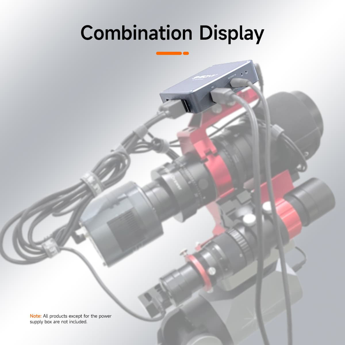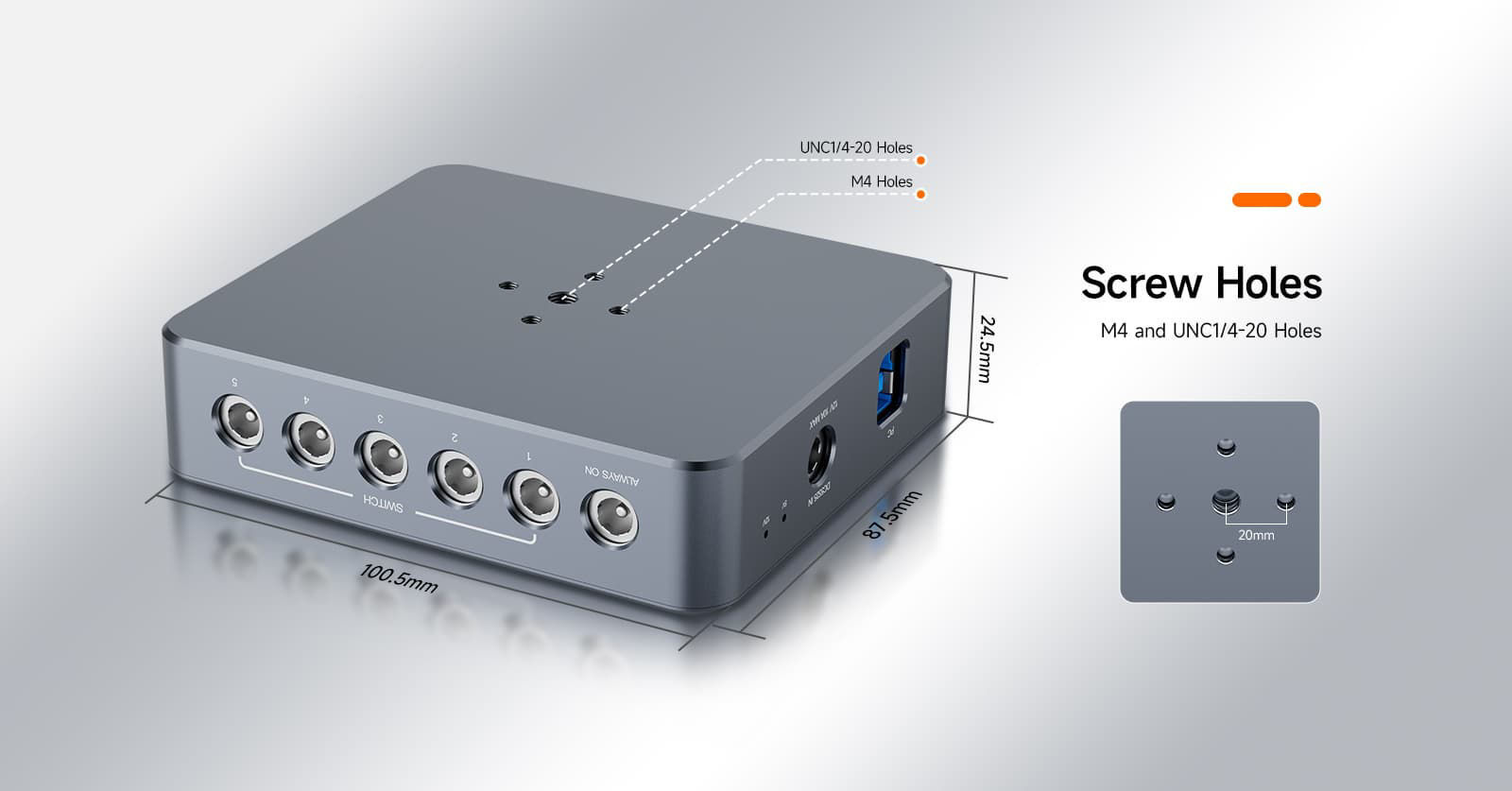 The power box is equipped with UNC1/4-20 and M4 screw holes to meet different installation requirements and prevent loose connections and power outages caused by moving, shaking, or dropping the power supply box during astrophotography.