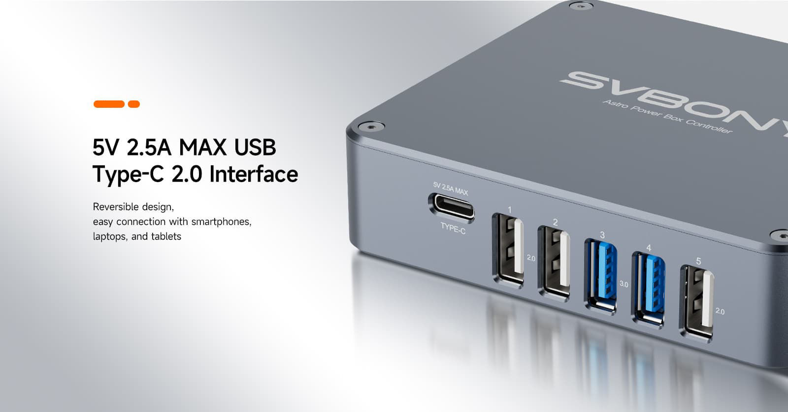 | Technical Data | | Brand | SVBONY | | Model | SV241 Pro | | Power Input | 12V 10A Max DC5.5*2.5 | | PC Input | USB3 Type B Connector | | DC Output: | Always on | 12V 6A MaxDC5.5*2.1 | | Cannot be switched on/off | | Switch1-5 | 12V 6A Max DC5.5*2.1 | | Can be switched on/Off | | Regulated | 0-15V adjustable Regulated Output | | Can be switched on/off 3A Max | | PWM1-2 | 12V 6A Max Black Colored RCA Connector | | Can be switched on/off | | PWM Control possible | | USB HUB | 2xUSB3.0 4xUSB2.0 | USB type-c & USB2.0-1&USB2.0-2 Can be switched on/off together | USB3.0-3&USB3.0-4&USB2.0-5 Can be switched on/off together | | USB Power Supply | 4xUSB2.0 | 5V 2.5A | | 2xUSB3.0 | 5V 2.5A | | Voltage/Current Monitor | Input current/ Voltage monitor | | Environment Sensor | 2.5mm TRRS Jack(4-Pole) | SHT40 Temperature & humidity sensor | | 2.5mm TRRS Jack(4-Pole) | DS08B20 Temperature probe | | Temperature Range | Operating Temperature: -10°C to 50°C (Celsius) | | Humidity Range | Operating Humidity: 5% to 85% RH (non-condensing) | | Dew Heater Control | 2 independent dewheaters | | Dewpoint temperature difference control | | Constant temperature control | | Manual control | | ASCOM Compatibility | YES | | Screw Holes | M4 and UNC1/4-20 Holes | | Net Weight/g | approx.210g | | Product Size/mm | 100.5x87.5x24.5 | | Circuit Protection | Electrostatic Discharge (ESD) Protection | | Reverse Polarity Protection | | Backflow Prevention | | Filtering Protection [Adapted for USB 3.0 Interface & DC Interface] | | Fusible Link | | Under-voltage Protection | | Over-voltage Protection | | Over-current Protection | | Short-circuit Protection | | Power Detection | | Smart Restart Function |