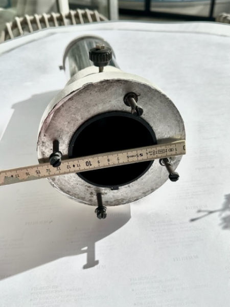 Eyepiece focuser with gear drive 82 mm, presumably from Wachter, weight 4100 grams, 180 mm focusing travel, diameter of mounting flange 148 mm, shortest overall length 140 mm, including 2" Baader clamp. Manufacturer unknown, probably Wachter
